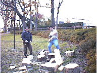 さぁ、こうして葵の紋所を入手してしまえば、怖いものはない。こうなると良くしたもので、幼稚園の子供友達経由の妻の友達で植木屋さんがいて、なんとエンジン式のチェーンソーまで借りれる事になったのである。正に鬼に金棒に原子爆弾状態である。こうしてすぐに第5次エノキカッパギツアーが告知され、土曜が雨だったので11/30に都合のついた懐かしのT隊員(現在ではタカさん)及び、先週に続いての登場となったK.Suzuki氏を引き連れ、徹底的なカッパギが行われた。1時集合だったが、K.Suzuki氏はやや遅れ、なんだかんだで現地でカッパギを開始したのは2時頃になってしまった。