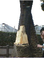 ![]() チェーンソーは初めて使ったので、始めはよく分からず、チェーンが外れたり安全装置が入って動かなくなってわからなかったりと悪戦苦闘したが、同時に借りていた刃渡りの長い鋸もかなり強力で、作業はかなりはかどった。どうにもならないのでチェーンソーについてはもう一度借りた家に取り扱いの指導を受けに行き、それからは無事に使いこなす事ができた。チェーンソーはさすがに素晴らしく強力だ。相手が朽ち木なので特に柔らかく、刃を入れるとまるでケーキを切るように気持ち良くブィーンと食い込んでいくのだ。あっという間に100キロ以上にも及ぶと思われる良質のエノキ材を切り出し、お持ち帰り用に細分した。もっともタカさんもK.Suzuki氏も持ち帰る量に限度があり、役所との約束上残った材やフレークは全て私が引き取り、以前から備蓄してあったものと合わせると自宅の在庫も100kgにも及ぶ事態となった。 K.S氏は「いやー許可を持ってるとなると誰かに見せたくなりますよね。誰か何してんのか聞いてくれませんかね?」などとはしゃいでいる。しょうがない奴だ。しかし実は私も全く同じ気持ちだった。実際その後、興味深そうに見ていたおじさんに何をしているのか尋ねられた時には、「こういうわけなんですよ」などと格好付けて微笑みながら許可証を見せてしまった。なるほどねぇ、というわけで少し話し込んでしまったが、どうもこのエノキは数十年前に落雷で上部が折れ、枯れたものであるという事をこの時教わった。上が折れている原因がわかった。それにしてもそんなに年月をかけてこのカワラタケははびこったのか!?