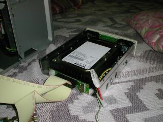 以上を買ったのは、前述の通り、まだ小さいマシンを作る前の話なので、購入後にまず私がこれらを組み込んでみたのは昔メインに使っていた Dual Celeron マシンである。このマシンは準サーバ用のアルミケースを使っているので、ハードディスクを固定するのは非常に簡単だった。ただし、変則的な大きさなので、縦に並ぶ 3.5インチベイの最下段にしかまともに入らなかった。