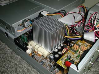 CPU 用の放熱フィンの取り付けは電源ファン交換と比べると非常にあっけなかった。ケースが低くて中が狭くて、フロッピーディスクドライブとの干渉が心配されたのだが、うまく買ってきた放熱フィンを取り付けることが出来た。この放熱フィンよりも大きなフィンも多分あるのだろうが、少なくとも私のベアボーンマシンに取り付けられるものとしてはこのあたりが限界だろう。