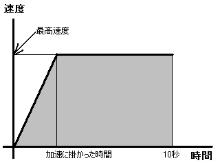 縦軸が速度で、横軸が時間である。速度と時間を掛けると距離になる。縦の長さと横の長さを掛けると長方形の面積が求められるように、速度の大きさと時間の長さから距離を求めるのに、面積を用いることが出来る。これは初歩的な積分である。図では、グレーの部分が面積にあたり、グレーの部分が 100m であるときに 100m 走ったことになるのである。