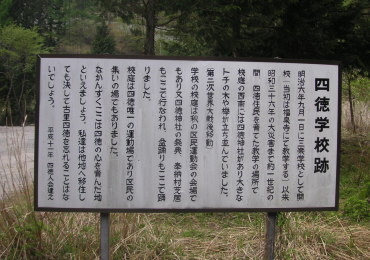 四徳(標高880m)は5つの地区(下村,小河内,中村,大張,平鈴)からなり,分校跡は中村にあります。広々とした分校跡の敷地の奥のほうには,盛り土の上に「心のふるさと 四徳学校跡」と刻まれた石碑(昭和46年建立)があり,碑の左手には往時からと思われるサクラの木がありました。