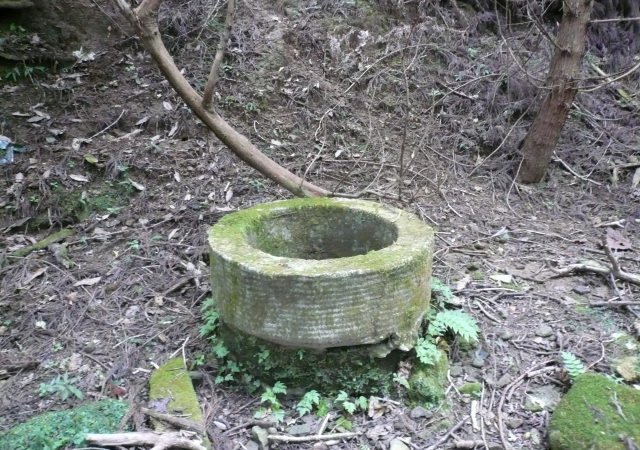 歩き始めて15分ほど,ドラム缶,欠けた瀬戸物,酒瓶などが見つかり,追原には到着したようですが,行止まりまで進んでもカエデが見つかりません。勘を働かせて行止まりを背にして左側の緩やかな枝道を進むと,石垣の上に大きなカエデが座り込むように立っていました。カエデの回り,スギが植えられた家屋跡の敷地では,コンクリート造りの水槽と石臼のような古い井戸を見つけました。井戸を覗くと,かなりの深さに水面が光っていました。