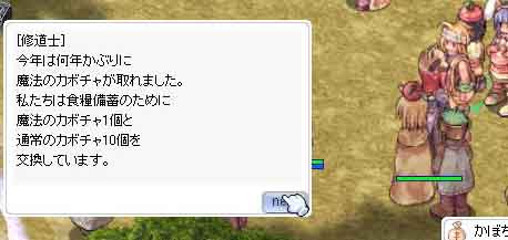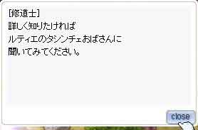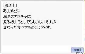 ここは、昔アコの転職の時に来た修道院 ですね。普段は非常に閑散としてる所です。 右上にいるブラスミさんは、NPCのくせに、 動いているんですよ。 なかなか、かわいらしいじゃないですか。 ここは、モンクの試験会場になってから、 格闘系のNPCが増えましたねぇ。 入り口には、ごっつい陳老子みたいなのが いましたし。 |